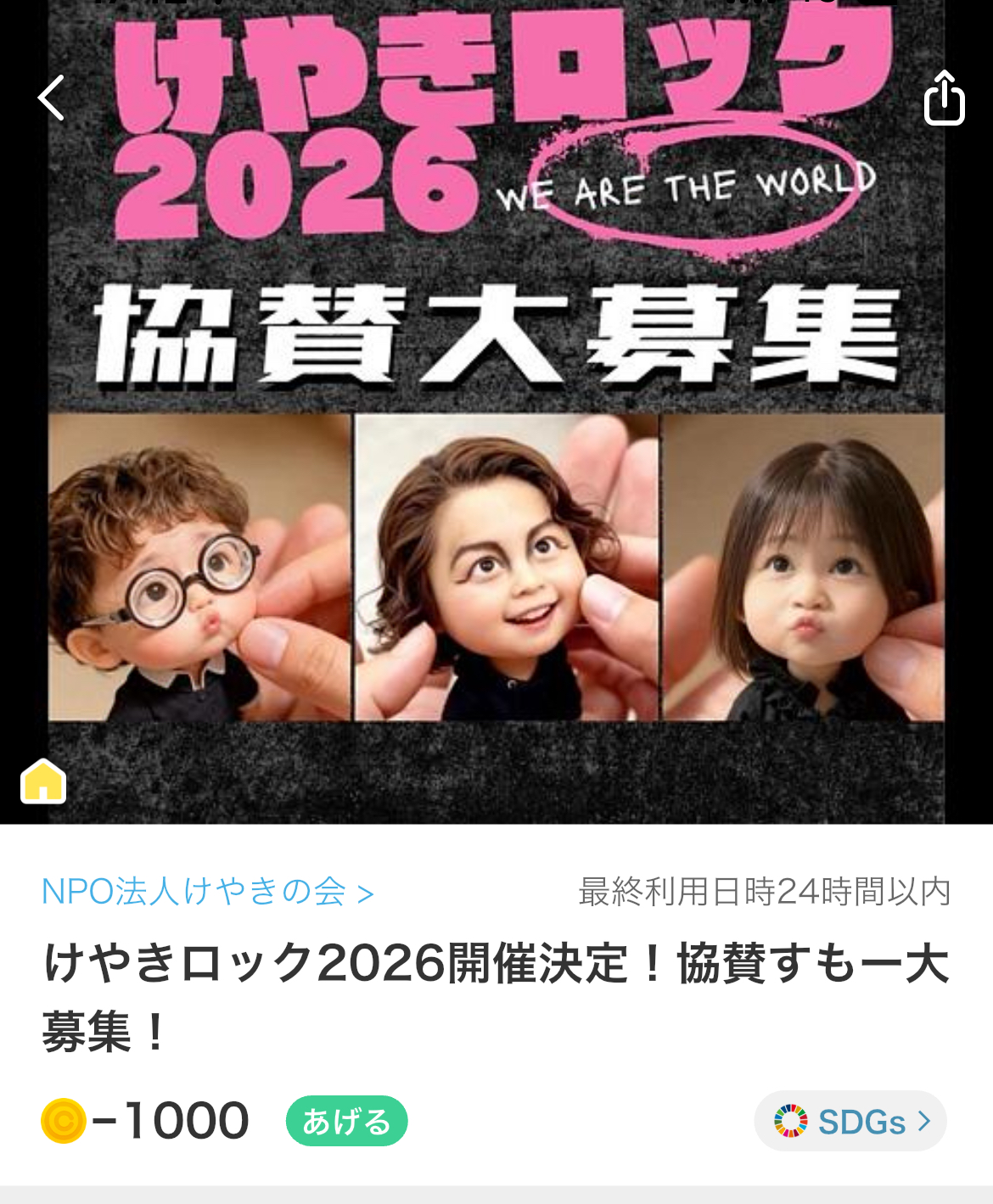 また、さきほどお話しした「けやきロック」について、まちのコインで協賛を募集したところ、実際に数名の方にご協力をいただきました!