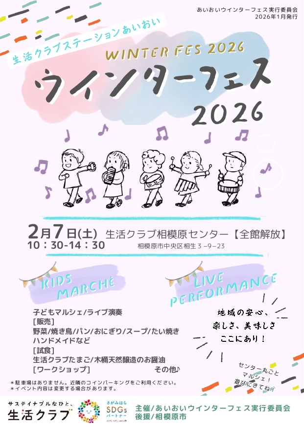 2月7日(土)10:30~14:30 生活クラブ相模原センター(相生3-9-23)にて、ウインターフェスを開催します。