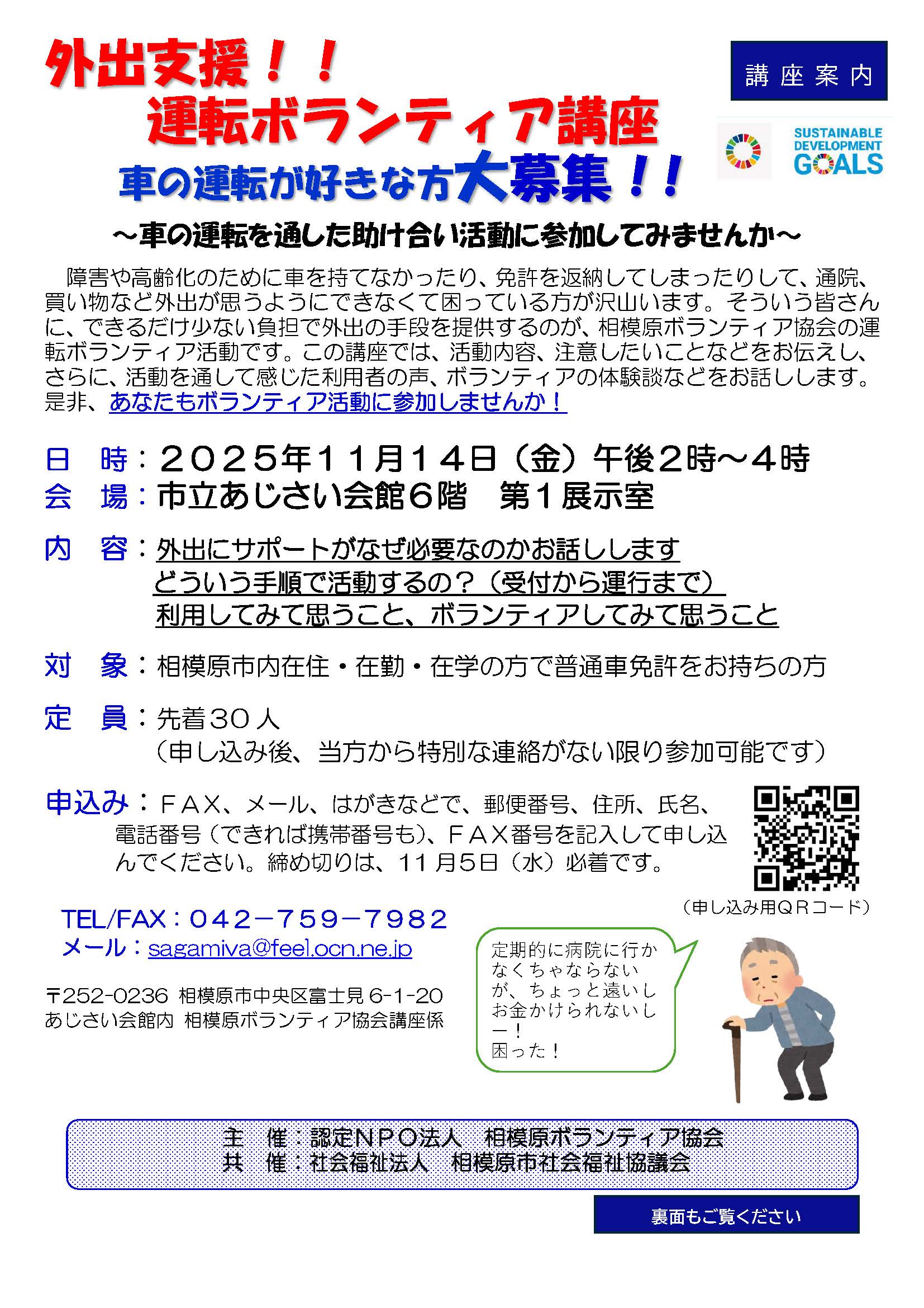障がいや高齢のために、病院への通院や買い物など、思うように外出できず困っている方が多くいらっしゃいます。 そういう皆さんに、できるだけ少ない負担で外出の手段を提供するのが、相模原ボランティア協会の運転ボランティア活動です。