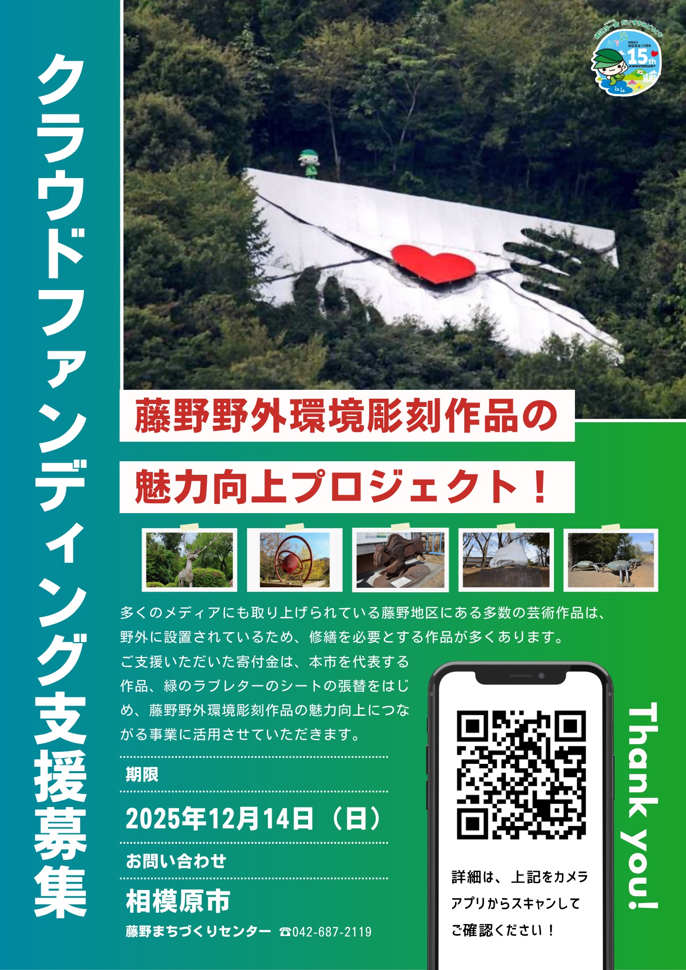この「緑のラブレター」をはじめとする藤野地区の野外環境彫刻作品は経年劣化により修繕が必要になっており、相模原市では、クラウドファンディング型ふるさと納税を実施しています。市の魅力であり誇りとなっているこれらの芸術作品を皆で支え、未来へと受け継いでいくために、皆様の温かいご支援とご協力を心よりお願いいたします。