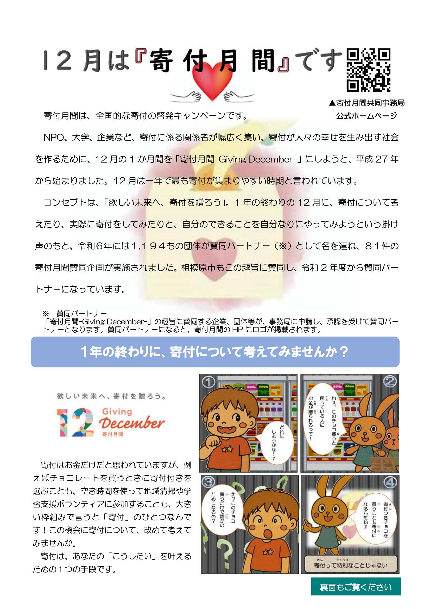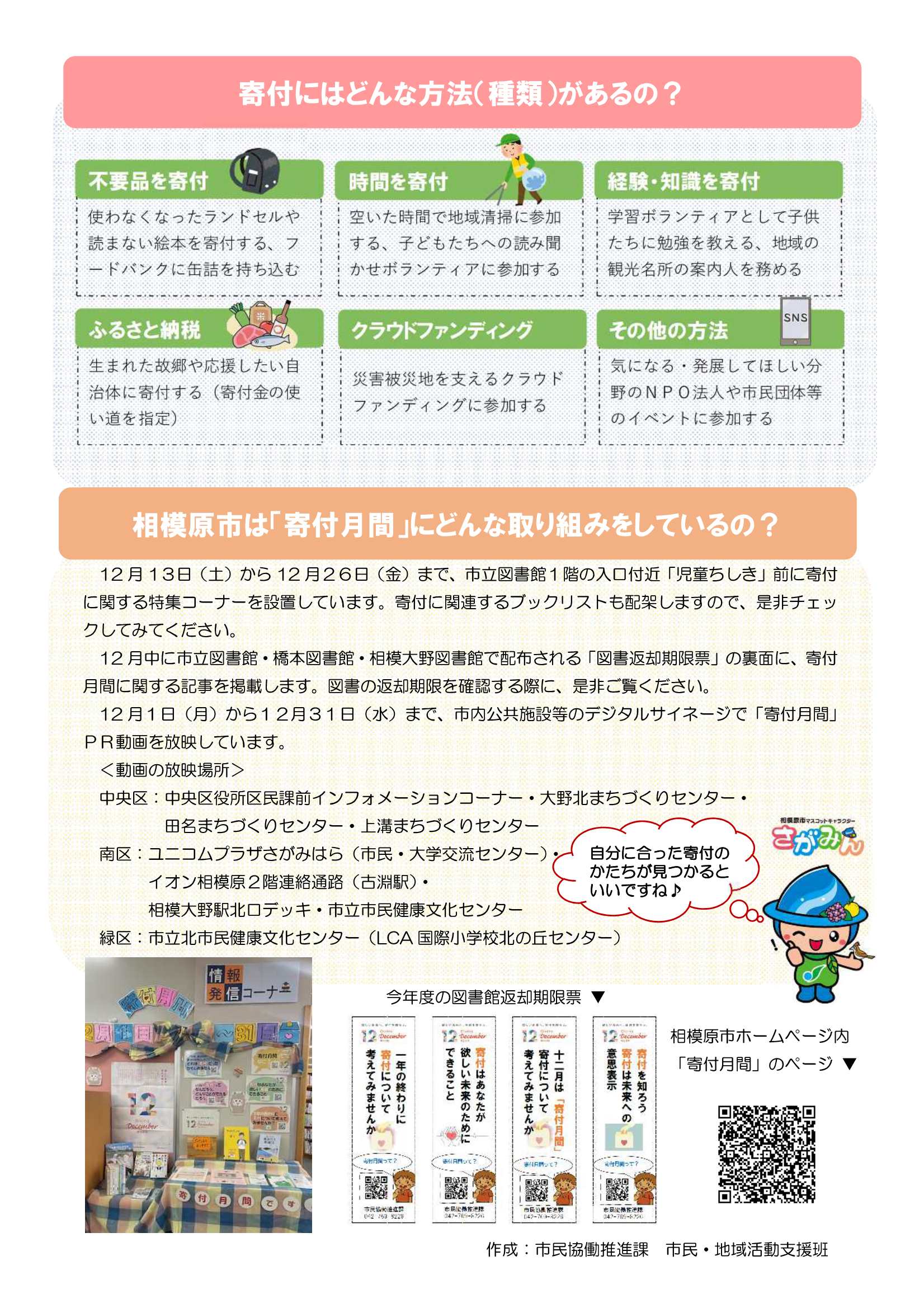 ・12月中に市立図書館・橋本図書館・相模大野図書館で配布される「図書返却期限票」の裏面に、寄付月間に関する記事を掲載しています。図書の返却期限を確認する際に、是非ご覧ください。