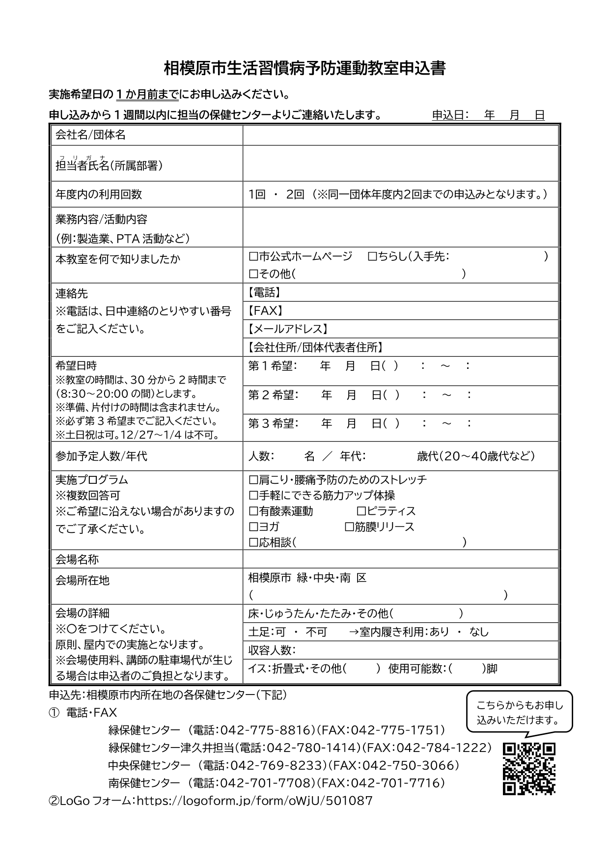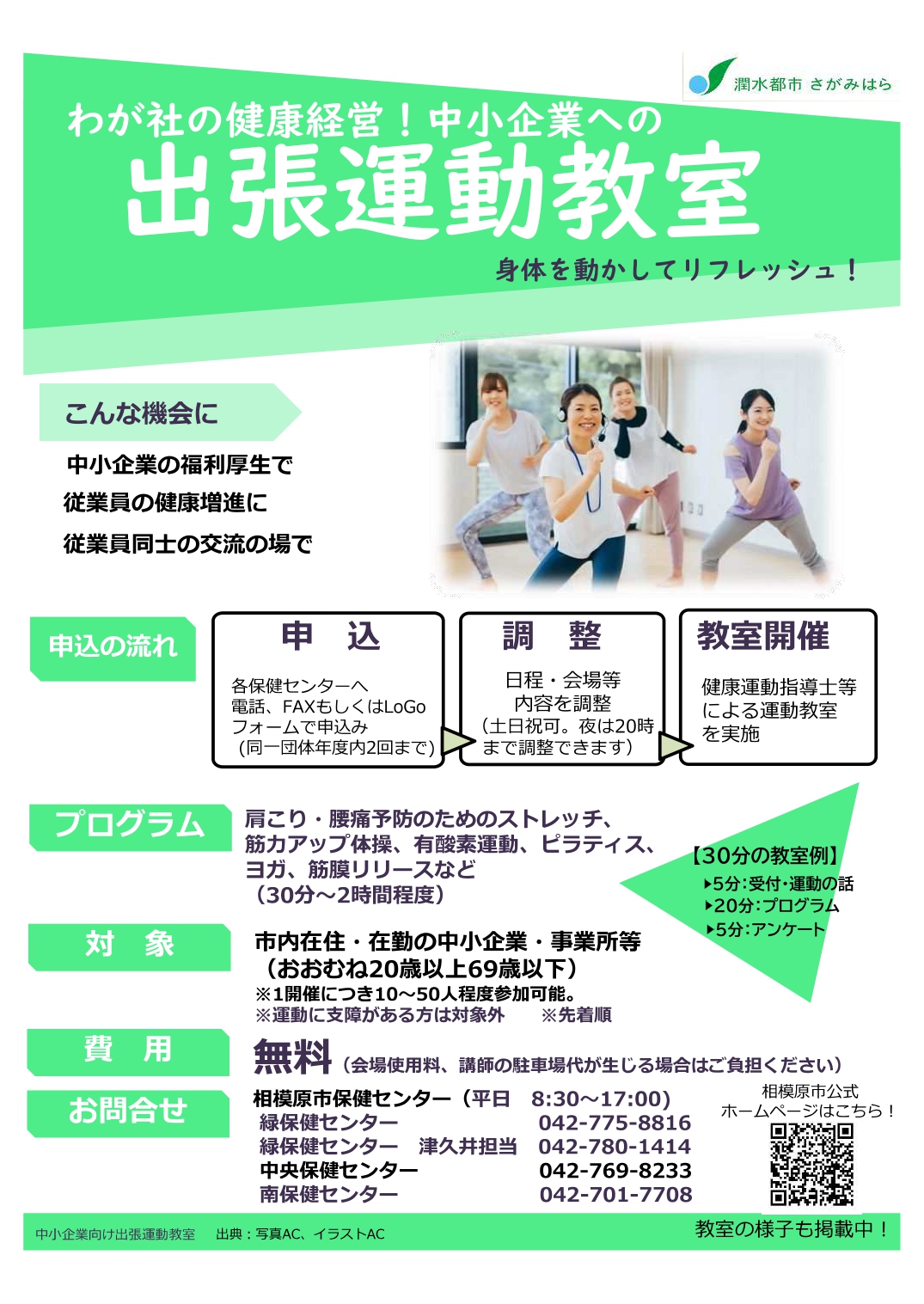 相模原市保健センターでは、健康運動指導士等によるミニ教室を市内中小企業・事務所等の指定した場所へ出張して開催をしています。午前8時30分~午後8時の間で実施中!土日祝日可!大好評の運動教室で、従業員の健康増進や福利厚生、交流の場やリフレッシュに是非ご活用ください。
