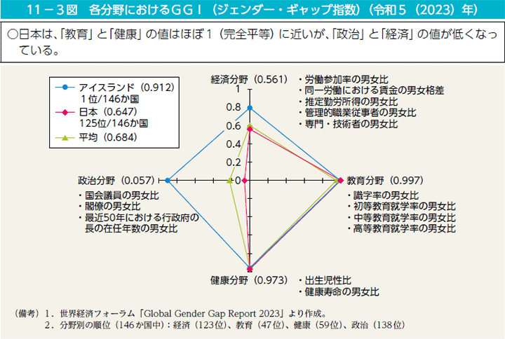 中でも、政治部門138位、経済部門で123位となっており、日本の女性の政治参加度の低さや、男女での収入格差がここから分かります。