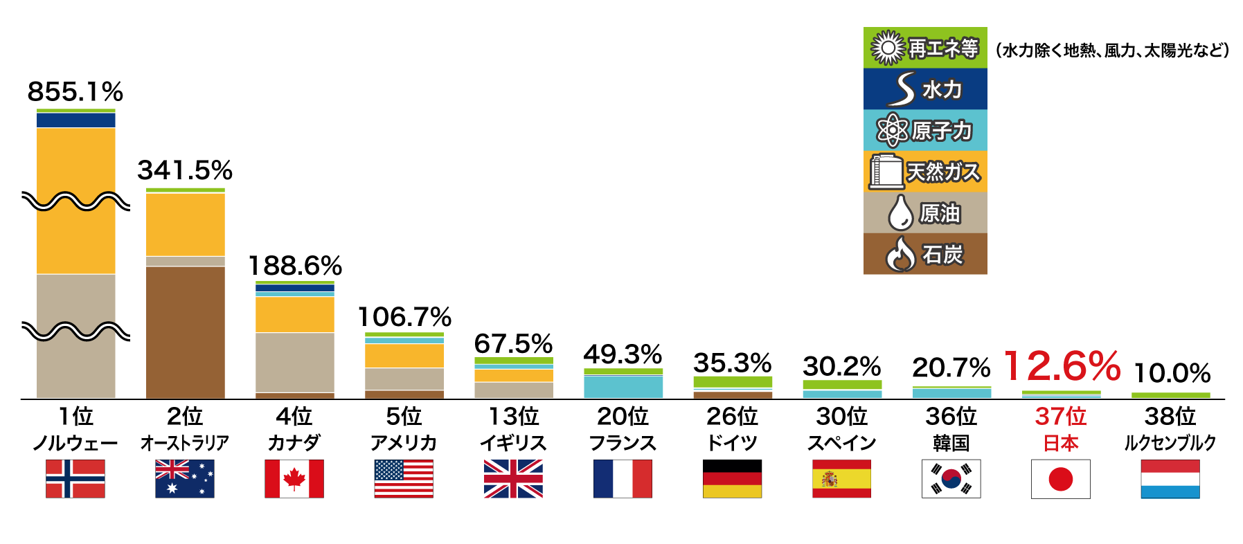 日本は世界で4番目に多くエネルギーを消費している国なのですが、下の表とおり、エネルギー自給率は12.8%しかなく、他の国と比べるととても低くなっています。