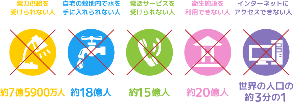 私たちが暮らす日本では当たり前のものが、発展途上国では、以下のような状況になっています。(国連広報センター「SDGs最新報告」及びUNICEF「持続可能な開発目標ファクトシート」参照)